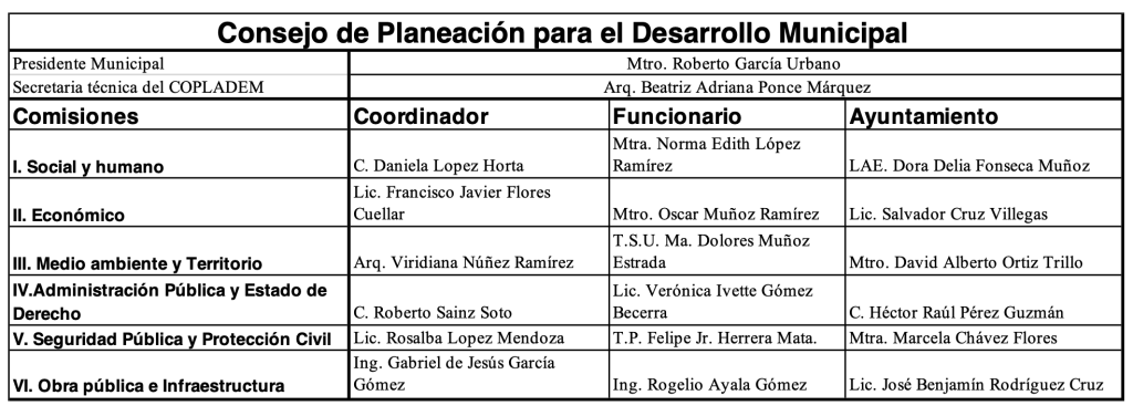 COPLADEM igualmente cuenta entre sus miembros, con representantes sociales, los directores de área afín a las comisiones y los regidores del H. Ayuntamiento comisionados.