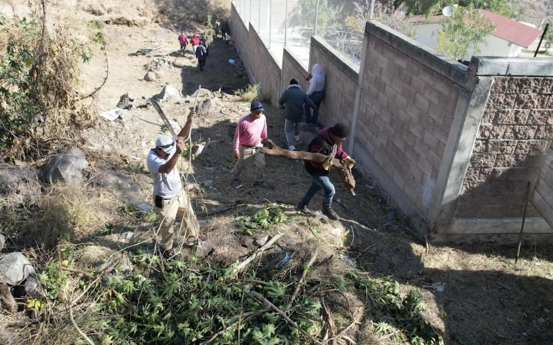 Purísima del Rincón, Gto. a 13 de marzo de 2026. –  Padres de familia de las escuelas de educación básica de preescolar, primaria y telesecundaria de la comunidad del Palenque, apoyadas por personal de Servicios Públicos Municipales, deshierbaron y retiraron 50 metros cúbicos de maleza y basura del arroyo que pasan detrás de las escuelas.